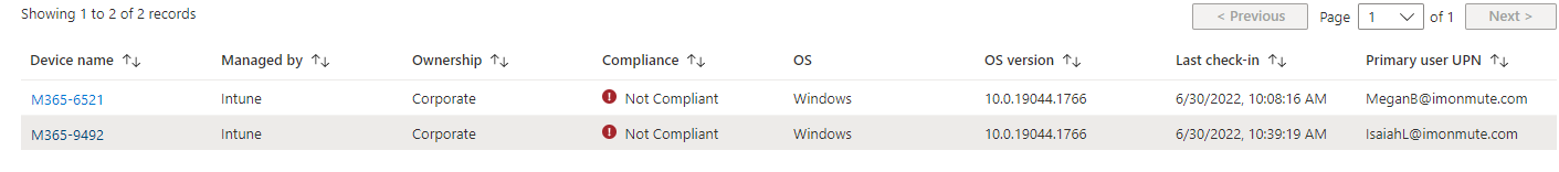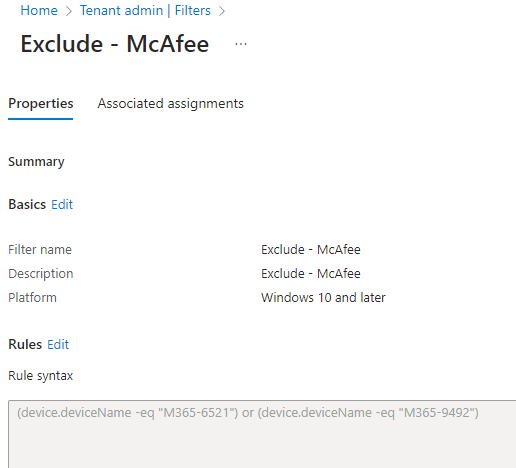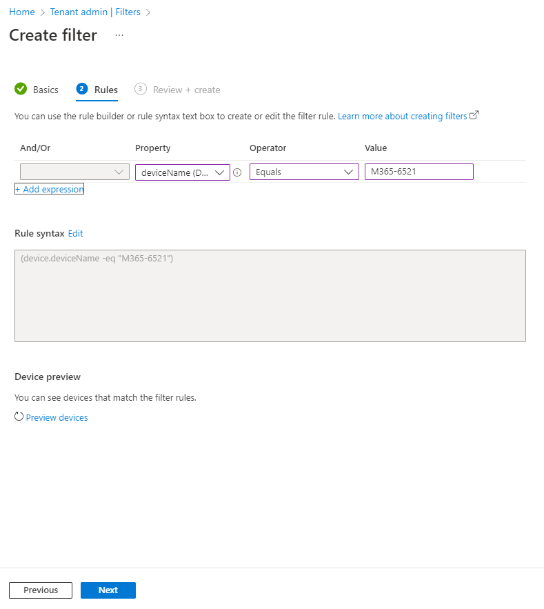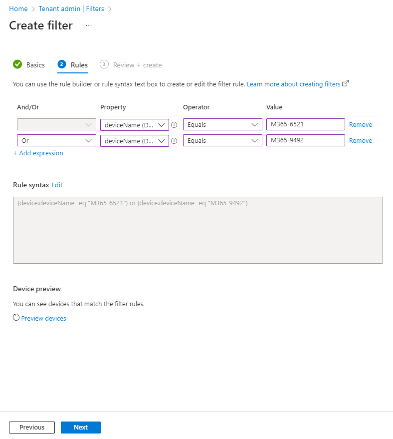 - Multiple devices: (device.deviceName -eq “M365-6521”) or (device.deviceName -eq “M365-9492”)
