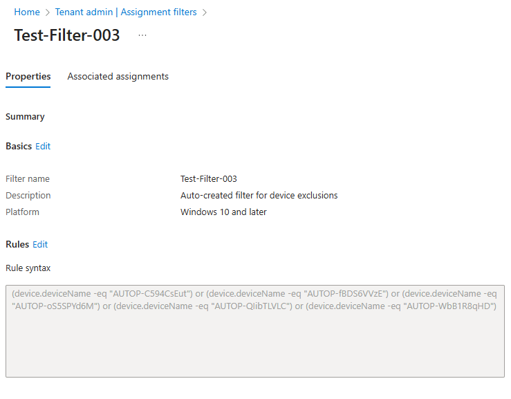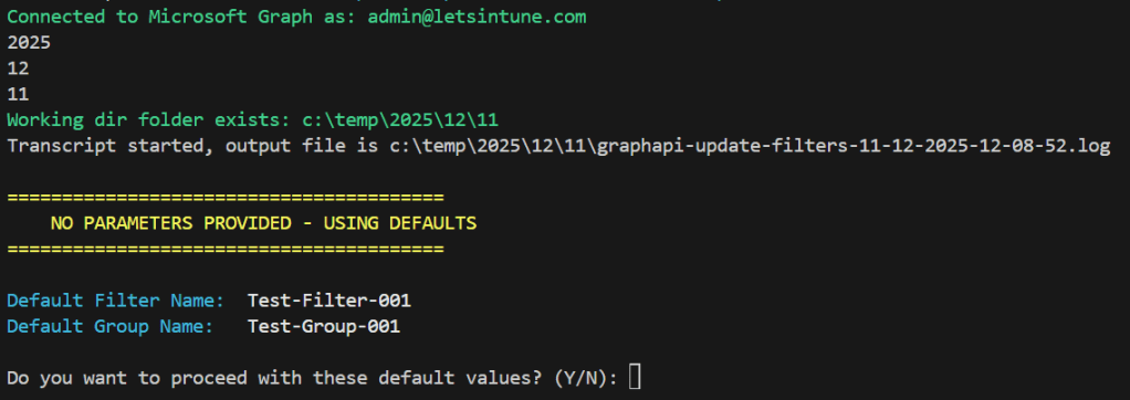 - if GroupName exists in Entra, all devices from there found in Intune (managed devices) will be added to the Filter Rule Syntax. Otherwise, it will ask for confirmation before creating it.