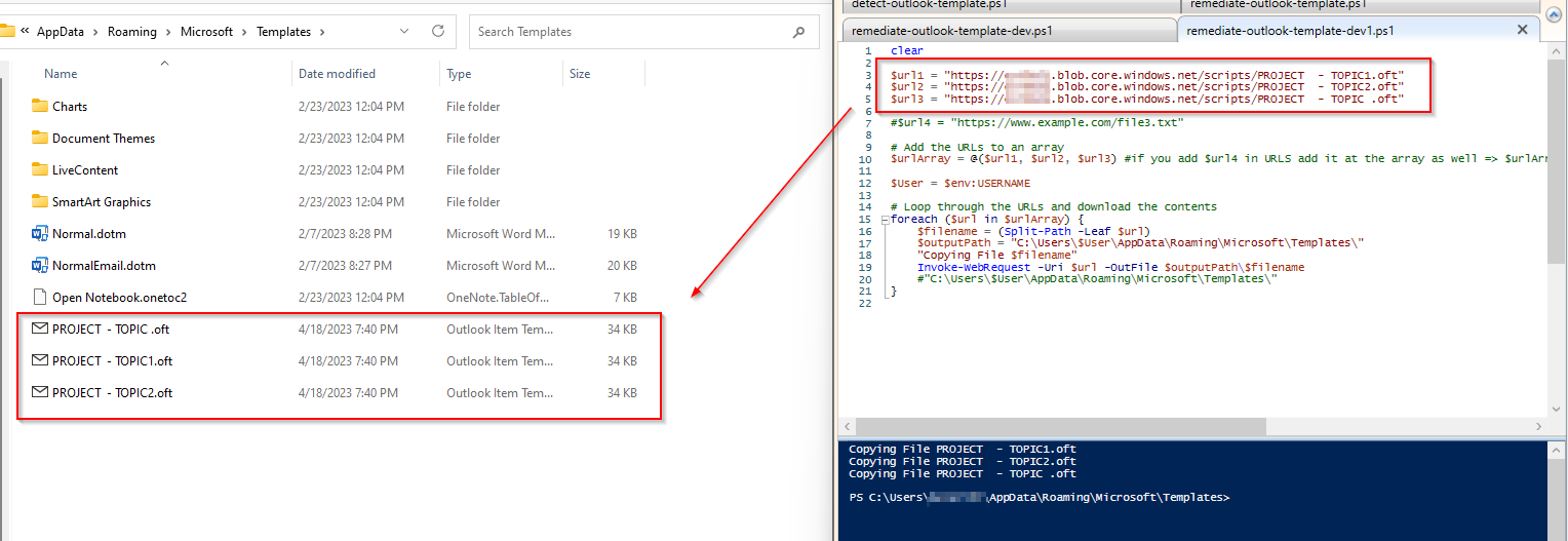 Remediates by copying the FileName.oft file from Azure blob storage.